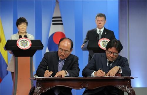 | △ 17일(현지시간) 콜롬비아 보고타시 대통령궁에서 박근혜 대통령과 후안 마누엘 산토스 콜롬비아 대통령이 지켜보는 가운데 이덕훈 한국수출입은행장과 네스토르 라울 파구아 구아우케 콜롬비아 개발은행 부행장이 금융협력 양해각서(MOU)에 서명하고 있다. <<수출입은행 제공>> |