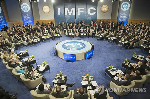 | △ 세계은행이 18일(현지시간) 미국 워싱턴 D.C에서 개최한 개발위원회에서는 반기문 유엔 사무총장, 김용 세계은행 총재, 최경환 경제부총리 겸 기획재정부 장관이 머리를 맞대고 지구촌 문제들을 논의했다. 사진은 이날 열린 IMF 국제통화금융위원회(IMFC) 모습. (EPA=연합뉴스) |