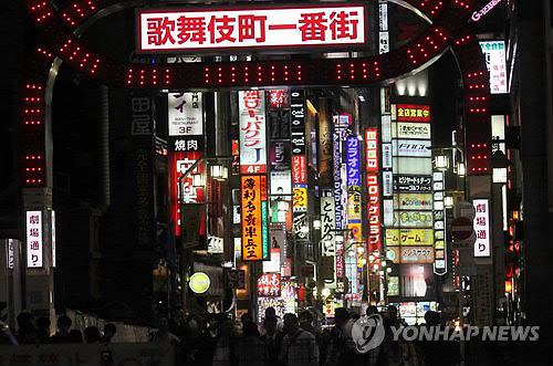 | △ : 18일 오후 일본 도쿄도(東京都) 신주쿠(新宿)구 가부키초(歌舞伎町)의 유흥업소 밀집지구 입구의 횡단보도 앞에서 행인들이 녹색 신호를 기다리고 있다. '가부키초 일번가(一番街)'라고 쓰인 간판 뒤로 유흥업소가 불야성을 이루고 있다. |