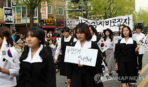| △ 1960년대 거리재현 퍼레이드 (서울=연합뉴스) 이승민 기자 = 4·19 혁명 국민문화제가 열린 18일 서울 강북구청사거리 인근에서 1960년대 거리재현 퍼레이드가 진행되고 있다. 2015.4.18 logos@yna.co.kr |