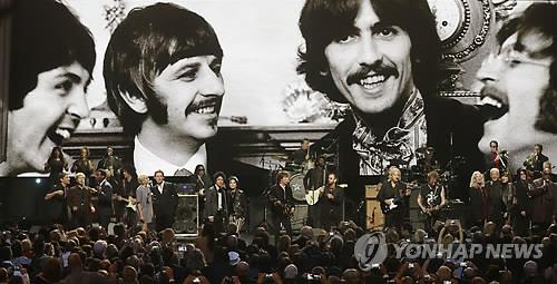 | △ (클리브랜드 AP=연합뉴스) 18일(현지시간) 미국 클리블랜드 퍼블릭홀에서 열린, 비틀즈 전 멤버 링고 스타(74. 비틀즈 배경사진 맨 왼쪽)의 '록 앤 롤 명예의 전당(Rock and Roll Hall of Fame)' 입성식 최종 결선에서 록 뮤지션들이 열연하고 있다. 비틀즈 멤버 가운데 폴 매카트니와 이미 고인이 된 존 레논과 조지 해리슨 및 그룹 비틀즈는 이미 명예의 전당에 입성했다. |