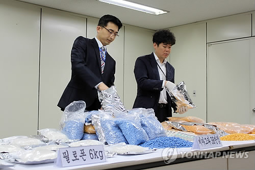 | △ 평택항 밀반입 적발된 필로폰과 가짜 발기부전치료제 (평택=연합뉴스) 최찬흥 기자 = 수원지검 평택지청이 20일 입항전수입신고제도를 악용, 평택항을 통해 밀반입하려다 세관에 적발된 필로폰과 가짜 발기부전치료제를 공개하고 있다. 2015.4.20 chan@yna.co.kr |
