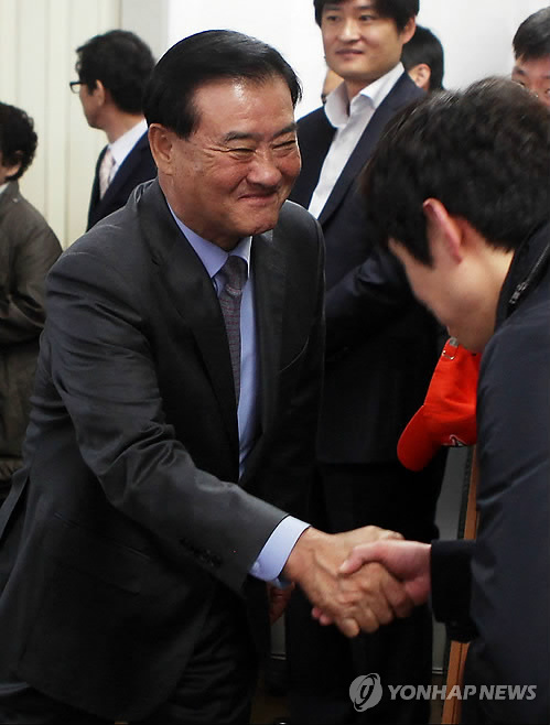| △ 강창희 전 국회의장 20대 총선 '불출마' 선언 (대전=연합뉴스) 김준호 기자 = 새누리당 강창희 전 국회의장이 20일 오후 지역구인 대전 중구 사무소에서 가진 당원간담회에서 지지자들과 악수를 하고 있다.2015.4.20 kjunho@yna.co.kr |