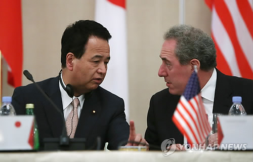 | △ 마이클 프로먼(오른쪽) 미국 무역대표부 대표와 아마리 아키라 일본 TPP 담당상 (EPA=연합뉴스DB) |
