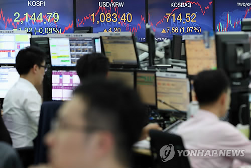 | △ 코스피 약세, 코스닥 710선 안착 (서울=연합뉴스) 이지은 기자 = 코스피는 전날보다 1.92포인트(0.09%) 내린 2,144.79로 장을 마쳤다. 코스닥은 710선에 안착했다. 21일 오후 서울 중구 외환은행 본점 딜링룸에서 직원들이 업무를 보고 있다. jieunlee@yna.co.kr |