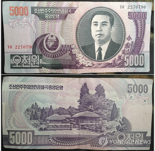이 지폐는 북한이 2009년 화폐 개혁 이전에 사용한 5천원짜리 구권(舊券)으로 파악됐다.