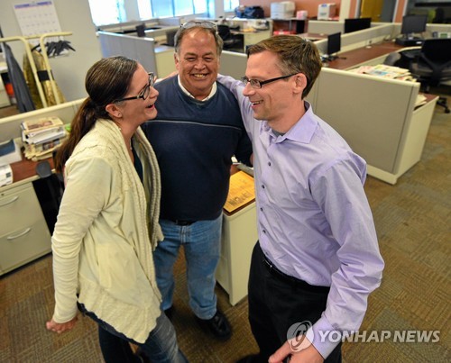 | △ The Daily Breeze's Rob Kuznia, from right, Frank Suraci and Rebecca Kimitch celebrate in the newsroom after the paper won the Pulitzer Prize for local reporting for a series of stories exposing corruption and cronyism in a small, cash-strapped Southern California school district, Monday, April 20, 2015 in Torrance, Calif. (Robert Casillas/The Daily Breeze via AP) |