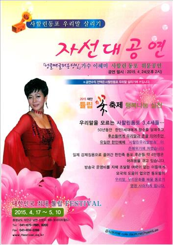 그는 "일제강점기 때 러시아 사할린으로 강제징용됐다가 남은 한인과 그 후손을 돕는 일은 아픈 우리 역사의 상처를 보듬는 일"이라며 "앞으로도 매년 튤립축제에서 호서예술전문학교 재능기부단과 함께 자선 공연을 열겠다"고 전했다.