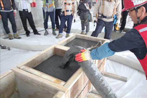 롯데건설은 이번 초고강도 콘크리트의 수직 압송을 위해 시멘트 사용량을 1천㎏/㎥ 이하로 줄이고 점성을 최소화한 콘크리트를 개발했다.
