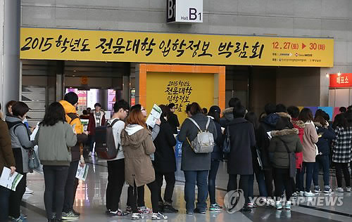| △ 2015학년도 전문대학 입학정보 박람회 (서울=연합뉴스) 박지호 기자 = 28일 오전 서울 강남구 삼성동 코엑스에서 진학사 주최로 열린 '2015학년도 전문대학 입학정보 박람회'에서 관람객들이 입장을 기다리고 있다. 2014.12.28 jihopark@yna.co.kr |