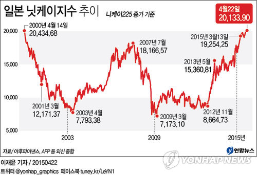 닛케이가 종가 기준으로 20,000선 위로 올라간 것은 'IT 버블(정보기술 관련 종목들이 주도한 주가 버블)'이 장세를 주도한 지난 2000년 4월 14일(20,434.68) 이후 15년 만에 처음이다.