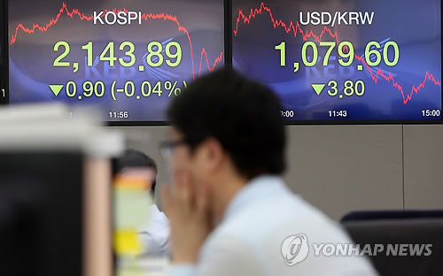 | △ 코스피 2,140선 방어 (서울=연합뉴스) 신준희 기자 = 코스피가 외국인과 기관의 매매 공방에 소폭 밀렸다. 22일 코스피는 전 거래일보다 0.90포인트(0.04%) 하락한 2,143.89에 거래를 마쳤다. 사진은 이날 오후 서울 명동 외환은행 본점 딜링룸. hama@yna.co.kr |