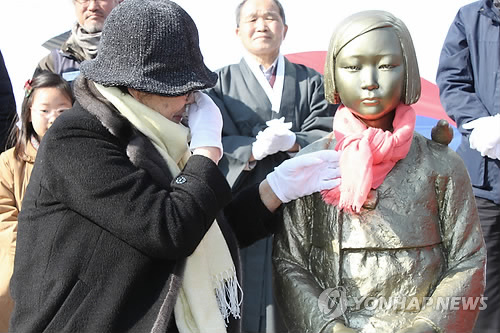 | △ 평화의 소녀상에 보며 눈물 훔치는 이용수 할머니(연합뉴스 자료사진) |
