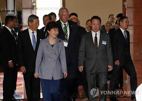 | △ 박 대통령, 한-칠레 비즈니스 포럼 참석 (산티아고<칠레>=연합뉴스) 도광환 기자 = 박근혜 대통령이 22일 오후(현지시간) 산티아고 시내 한 호텔에서 열린 한-칠레 비즈니스 포럼에 참석해 박용만 대한상의회장, 뮐렌브로크 칠레 산업협회장 등과 함께 입장하고 있다. dohh@yna.co.kr |