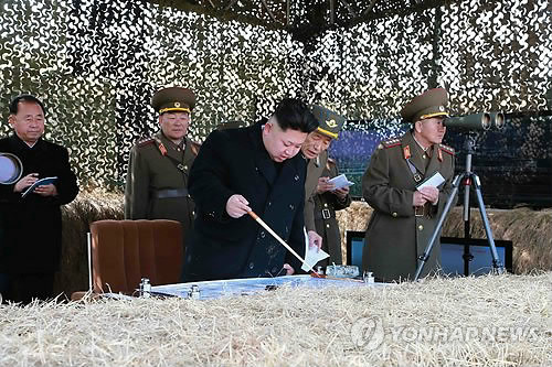 | △ 북한 공군의 비행장 타격·복구 훈련 참관하는 김정은 국방위원회 제1위원장. 2015.3.20 |