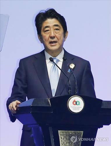 | △ (자카르타 교도=연합뉴스) 아베 신조(安倍晋三) 일본 총리가 2015년 4월 22일(현지시간) 인도네시아 자카르타에서 열린 반둥회의 60주년 기념 아시아·아프리카 정상회의에서 연설하고 있다. |
