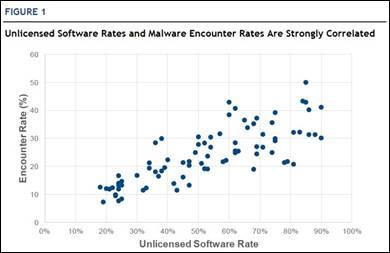 보고서에 따르면 불법 소프트웨어 비율과 악성코드 노출률이라는 두 변수 간 통계적 상관계수는 0.79였다. 상관계수가 1에 가까울수록 두 변수 간 연관성이 크다고 해석된다.