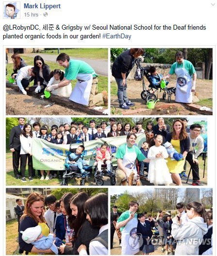 | △ 리퍼트 대사, 대사관저 텃밭서 장애학생들과 스킨십 (서울=연합뉴스) 마크 리퍼트 주한 미국대사가 22일 서울농학교 학생들과 함께 서울 정동 미국 대사관저에서 채소 심기 행사를 가졌다고 자신의 페이스북에 글과 사진을 올렸다. 이들 장애 학생과 함께 관저 내 텃밭에 상추, 고추, 가지, 토마토 등을 심으며 '지구의 날' 의미를 되새기는 행사를 한 것이다. ( 리퍼트 대사 페이스북) |
