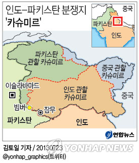 | △ <그래픽> 인도-파키스탄 분쟁지 '카슈미르' (서울=연합뉴스) 이재윤 기자 = 1947년 영국 식민지배에서 인도와 파키스탄이 각각 분리독립하면서 영유권을 놓고 치열한 전쟁을 벌인 카슈미르 지역. 인도는 카슈미르 전역을 자국령으로 표기한 지도만 공식적으로 인정하고 있다. yoon2@yna.co.kr @yonhap_graphics(트위터) |