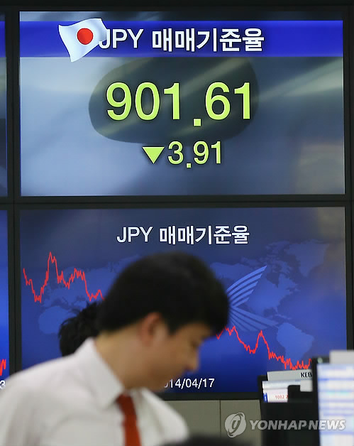 23일 오후 3시31분 현재 서울 외환시장에서 원·엔 재정환율은 오전 6시 뉴욕시장 대비 2.42원 오른 100엔당 902.75원을 기록했다.
