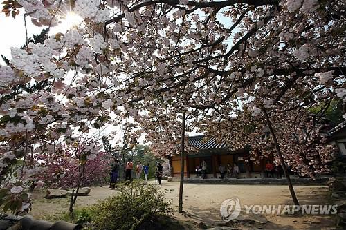 백색, 연분홍, 진분홍, 옥색, 적색의 다섯가지 색 왕벚꽃은 사찰과 어우러져 한 폭의 동양화 같은 풍경을 연출한다.
