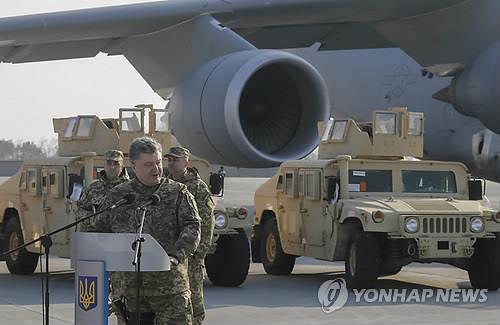| △ 지난 3월 25일 미국의 비살상무기가 키예프에 도착해 표트르 포로셴코 우크라이나 대통령이 연설하는 모습 |