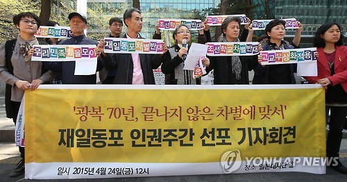 '우리 학교와 아이들을 지키는 시민모임'은 24일 정오 서울 종로구 중학동 일본대사관 앞에서 '재일동포 인권주간' 선포식을 열고 "광복 70년, 한·일 국교 정상화 50년이 됐어도 재일동포에 가해지는 일본 사회의 차별은 여전하다"고 목소리를 높였다.