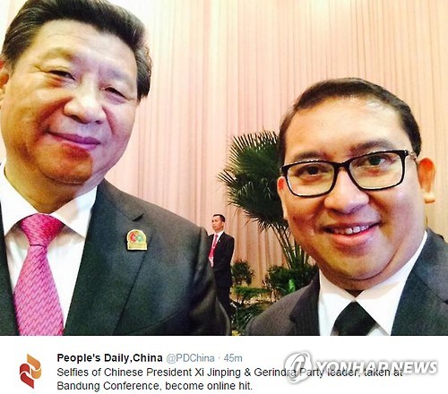 시 주석은 최근 인도네시아 자카르타에서 열린 반둥회의 기간 회의장에서 인도네시아 정당 지도자와 셀카를 촬영했다.