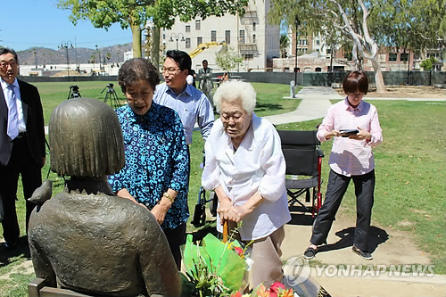 | △ (로스앤젤레스=연합뉴스.자료사진) 작년 7월 일본군 위안부 참상을 증언하기 위해 미국을 방문 중인 이옥선(87)·강일출(86) 할머니가 캘리포니아주 글렌데일시 시립공원에 세워진 `평화의 소녀상'을 찾아 헌화하고 묵념하는 모습. |