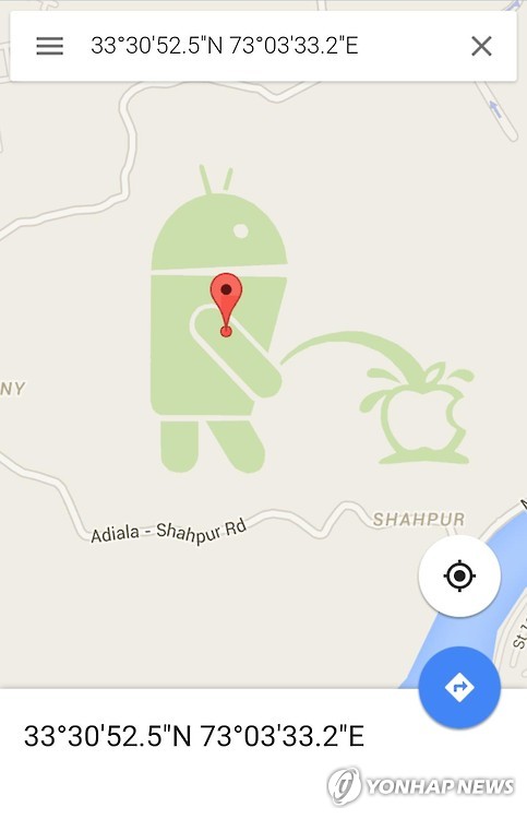 (샌프란시스코=연합뉴스) 임화섭 특파원 = 구글 모바일 운영체제(OS) 안드로이드의 마스코트 '안드로보이'가 애플 로고에 오줌을 깔기는 그림이 구글 지도에 한때 표시됐다.