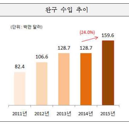 26일 관세청 통계에 따르면 올해 1분기 완구 수입은 지난해 같은 기간보다 24% 증가한 1억5천960만달러로 역대 최고치를 기록했다. 2011년 1분기 8천240만달러에서 4년 새 거의 두 배로 늘어난 것이다.