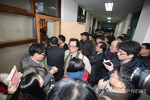 | △ '총장선출 내홍' 동국대 학생들 이사장실 점거농성 (서울=연합뉴스) 임헌정 기자 = 차기 총장 선임을 놓고 극심한 내홍을 겪는 동국대에서 신임 이사장 선출에 반대하며 11일 오후 이사장실 점거 농성에 들어간 학생들과 이사회 측이 대치하고 있다. 2015.3.11 |
