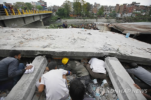 | △ 네팔 지진현장에 진출한 국내 건설사들 "큰 피해 없는 것으로 알려졌다. 사진은 카트만두의 붕괴된 건물 잔해 밑에서 구조작업하는 모습.(카트만두 AP=연합뉴스) |