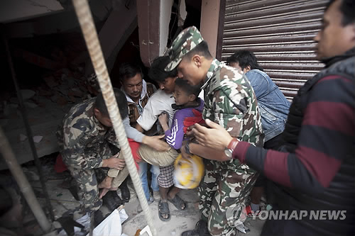 | △ 빨리 병원으로 (카트만두 AP=연합뉴스) 네팔을 강타한 규모 7.9의 강력한 지진으로 사망자 수가 25일(현지시간) 1천500여 명으로 늘어난 가운데 카트만두의 무너진 건물에서 몸을 다친 채 구조된 한 어린이가 병원으로 급히 옮겨지고 있다. marshal@yna.co.kr |