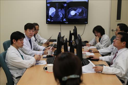 | △ 신설된 대장암 간 전이 팀이 서울아산병원 암병원 외래 통합진료실에 모여 대장암 수술 후 간으로 암이 전이된 한자의 치료 계획을 세우고 있다. |