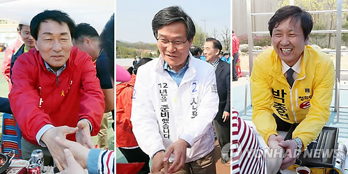 | △ 지지 호소하는 안상수·신동근·박종현 (인천=연합뉴스) 윤태현 기자 = 4·29 재·보궐선거 인천 서구·강화을에 출마한 새누리당 안상수(왼쪽부터)·새정치민주연합 신동근·정의당 박종현 후보가 26일 오후 인천시 강화군과 서구 곳곳에서 열린 체육대회에서 시민에게 지지를 호소하고 있다. 2015.4.26 tomatoyoon@yna.co.kr |