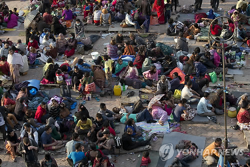 | △ 집밖으로, 집밖으로… (카트만두 AP=연합뉴스) 대지진이 발생한 네팔에서 26일(현지시간) 수십차례의 여진이 이어지자 공포를 느낀 카트만두의 주민들이 집을 빠져나와 바산타푸르 두르바르 광장에서 노천 생활을 하고 있다. marshal@yna.co.kr |