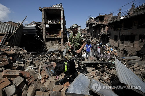 | △ 한 명이라도 더 찾아야 할텐데 (카트만두 AP=연합뉴스) 이틀전 대지진이 강타한 네팔 수도 카트만두 교외 박타푸르에서 27일(현지시간) 구조대원이 탐지견과 함께 폐허 더미 사이를 살피며 지나고 있다. 지난 25일 발생한 지진으로 인한 사망자가 3천600명을 넘어선 가운데 카트만두와 인구 밀집지역인 주변 카트만두 계곡 주민 수만명이 집을 잃고 노숙자가 됐다. bulls@yna.co.kr A rescue team with a sniffer dog walks at the site of destruction caused by Saturday� earthquake in Bhaktapur, on the outskirts of Kathmandu, Nepal, Monday, April 27, 2015. A strong magnitude earthquake shook Nepal� capital and the densely populated Kathmandu valley on Saturday devastating the region and leaving tens of thousands shell-shocked and sleeping in streets. (AP Photo/Niranjan Shrestha) |