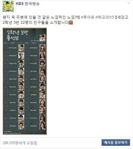 (서울=연합뉴스) 조민정 기자 = KBS 2TV 새 월화드라마 '후아유-학교2015'이 후끈한 온라인 인기를 누리고 있다.