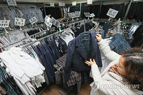 | △ 새해 교복 학교주관으로 구매 (서울=연합뉴스) 교복 학교주관 구매 = 새해부터 모든 국·공립 중고등학교 신입생은 학교를 통해 교복을 사게 된다. 학교가 경쟁입찰로 교복 공급업자를 선정하고 신입생은 교복 구매대금을 학교에 내는 방식이다. 학생들이 개별적으로 구입할 때보다 저렴하게 교복을 살 수 있다. 교복 착용 여부와 시기, 구매일정 등의 세부사항은 신입생 배정이 발표되고 나서 학교의 안내를 받아야 한다. 2014.12.28 << 연합뉴스 DB >> photo@yna.co.kr |