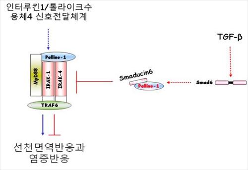 | △ 새로운 펩티트 치료 후보물질 스매듀신-6(smaducin-6)이 염증반응을 일으키는 펠리노1(Pellino-1) 단백질과 결합해 염증반응을 매개하는 톨유사수용체4(TLR4)의 신호전달 기전을 억제하는 과정을 보여주는 그림. |