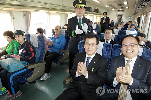 | △ (청주=연합뉴스) 충북 최남단인 영동군과 최북단인 단양군을 잇는 충북 종단열차가 운행 1주년을 앞두고 있다. 사진은 운행 첫날인 지난해 5월 1일 청주역에서 이 열차에 탄 이시종(오른쪽에서 두번째) 지사. 2015.4.28 |