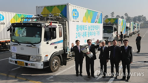 | △ '북녘에 비료 전하고 오겠습니다' (파주=연합뉴스) 임병식 기자 = 28일 경기도 파주시 임진각에서 에이스경암 안유수 이사장(왼쪽 두번째) 등 재단 관계자들이 취재진에게 손을 흔들고 있다. 이날 에이스경암은 복합비료, 온실 건설자재, 영농기자재 등 농업협력물자 컨테이너 22대 분량을 황해북도 사리원시에 전달할 예정이다. 민간단체 대북 비료지원은 지난 2010년 5·24 제재 조치 이후 이번이 5년 만에 처음이다. |