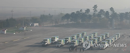 | △ 5·24 조치 이후 첫 비료 대북지원 (파주=연합뉴스) 임병식 기자 = 28일 경기도 파주시 임진각에서 재단법인 에이스경암의 대북지원 차량이 경의선 남북출입사무소로 이동하기 위해 대기하고 있다. 이날 에이스경암은 복합비료, 온실 건설자재, 영농기자재 등 농업협력물자 컨테이너 22대 분량을 황해북도 사리원시에 전달할 예정이다. 민간단체 대북 비료지원은 지난 2010년 5·24 제재 조치 이후 이번이 5년 만에 처음이다. 2015.4.28 andphotodo@yna.co.kr |
