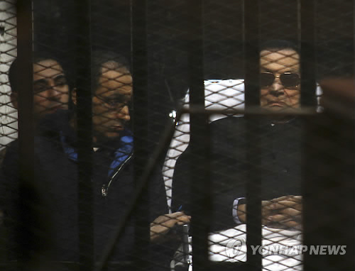 | △ 철망 안 들것에 누워 선고 기다리는 무바라크 (AP=연합뉴스) 2011년 민주화 시위를 유혈진압한 혐의로 기소된 호스니 무바라크 전 이집트 대통령이 29일(현지시간) 카이로 외곽 경찰학교 특별법정에서 선고 공판이 진행되는 동안 철망이 쳐진 피고인실 안에서 들것에 누워있다. 옆에 무바라크의 아들 가말(왼쪽 두번째)의 모습도 보인다. 이날 카이로 형사법원은 무바라크에게 무죄를 선고했다. marshal@yna.co.kr (AP Photo/Tarek el-Gabbas) |