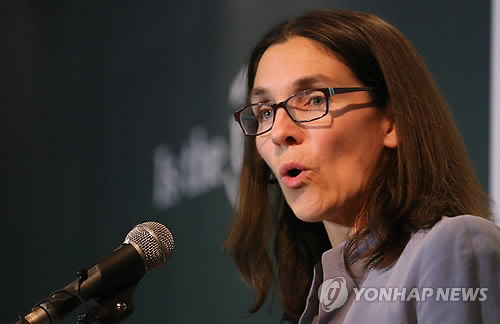 | △ 질문에 답하는 알렉시스 더든 코네티컷대 교수 (서울=연합뉴스) 최재구 기자 = 알렉시스 더든 미국 코네티컷대 교수가 28일 서울 하얏트호텔에서 열린 아산플래넘에서 기자회견을 하며 질문에 답하고 있다. 2015.4.28 jjaeck9@yna.co.kr |