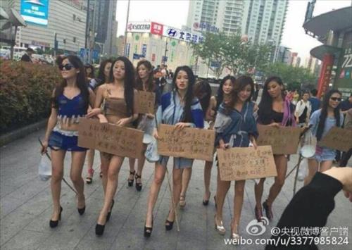 28일 중국언론들에 따르면 최근 중국의 웨이보(微博, 중국판 트위터)에는 10명 안팎의 모터쇼 여성모델들이 상하이 시내에서 거지 복장으로 '밥 좀 주세요' 등의 문구가 쓰인 피 피켓을 들고 거리행진을 하는 모습을 담은 사진들이 올라왔다.