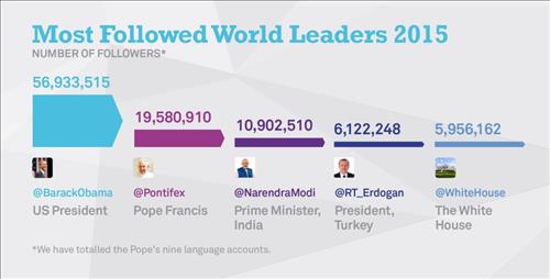보고서에 따르면 오바마 대통령의 트위터 계정(@BarackObama) 팔로어는 5천693만 명으로 수년째 팔로워 1위를 고수하고 있다. 지난해 4천371만 명에서 1천만 명 이상 늘었다.