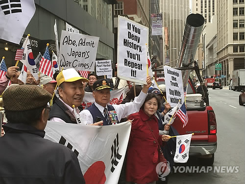 (샌프란시스코=연합뉴스) 임화섭 특파원 = "아베 라이어(아베는 거짓말쟁이)! 아베 라이어! 아베 라이어!"