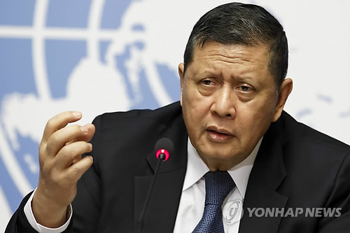 | △ 마루즈키 다루스만 유엔 북한인권 특별보고관이 지난달 16일(현지시간) 스위스 제네바의 유럽유엔본부에서 기자회견을 하고 있다. 다루스만 특별보고관은 이날 제28차 유엔 인권이사회 회의에 참석해 북한의 외국인 납치와 강제실종 문제에 대한 국제사회의 관심을 촉구했다.2015.4.29.<<연합뉴스DB>> |